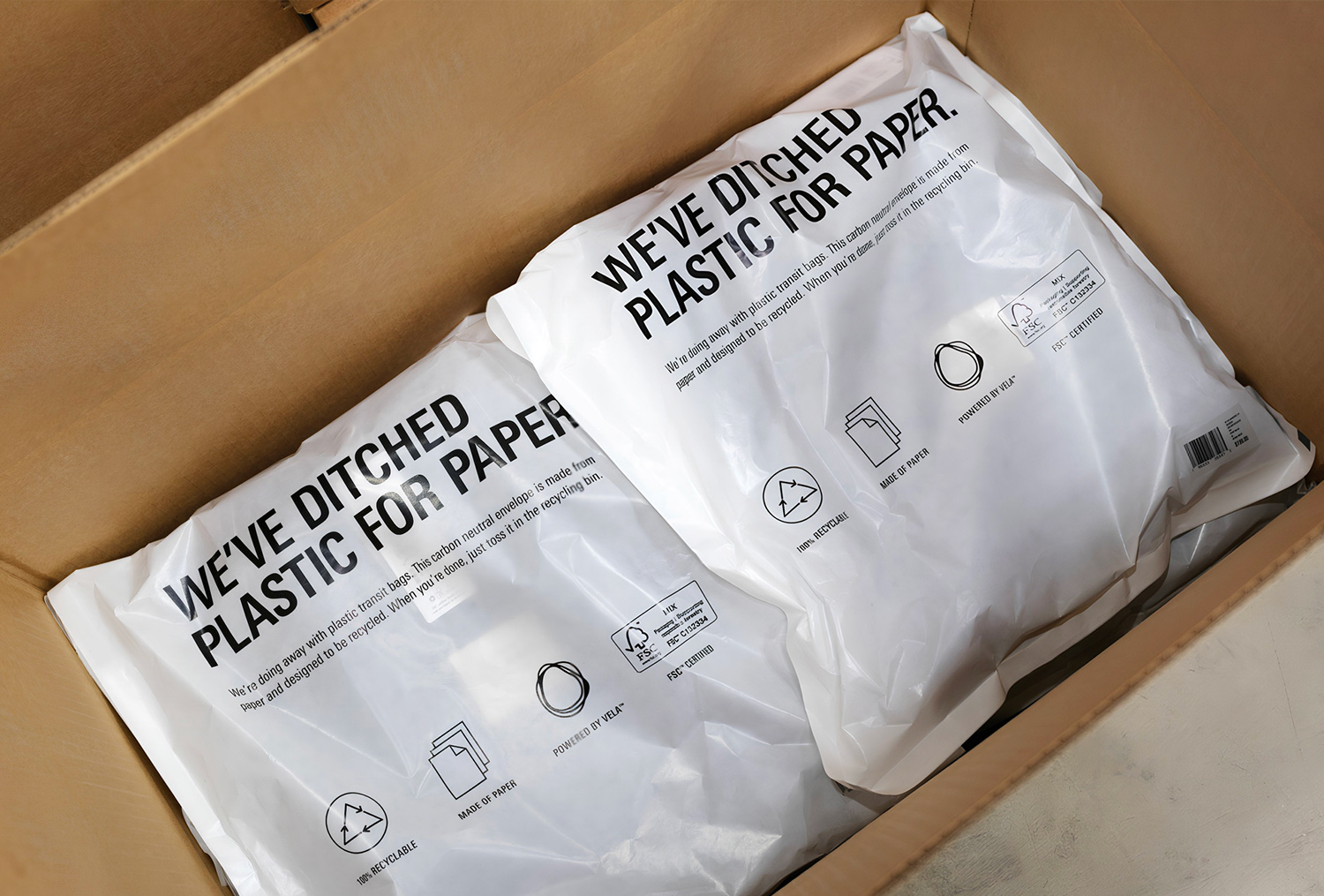 Outerknown selected Vela™ for its curbside recyclability, FSC™-certified materials, semi-transparent performance, and seamless integration into existing fulfilment workflows.